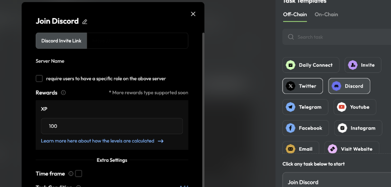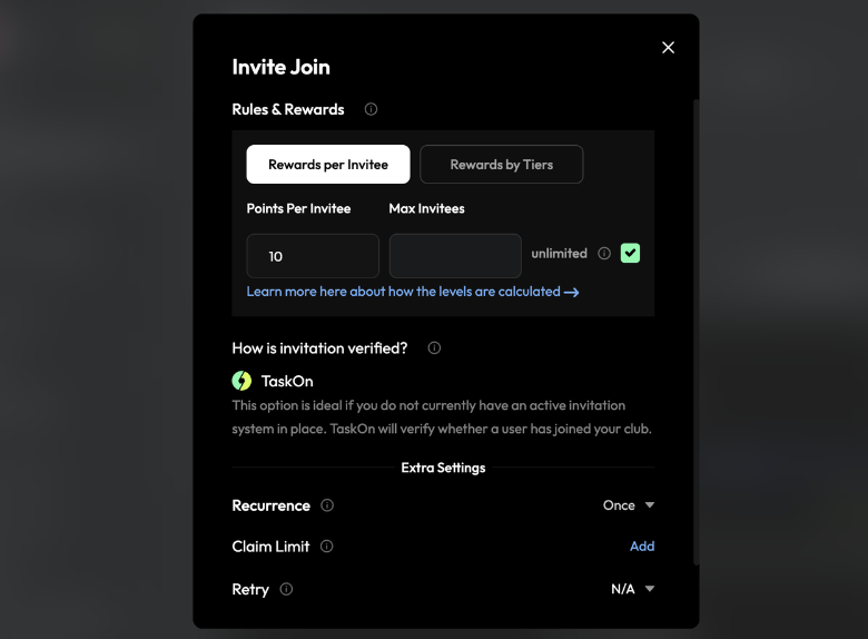 Currently, TaskOn’s invitation incentive task templates support two reward formats: Rewards per Invitee and Rewards by Tiers: