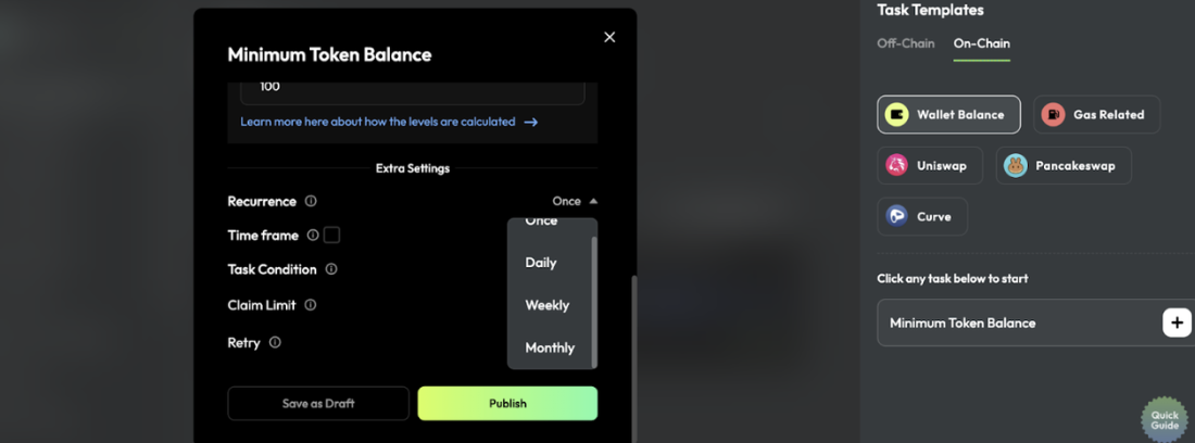 In TaskOn Community’s task templates, there’s a critical task setting option: Recurrence. When setting up community tasks, administrators can specify how often community members should complete these tasks—options include Once, Daily, Weekly, and Monthly. Once set, tasks refresh automatically without needing repetitive manual actions.