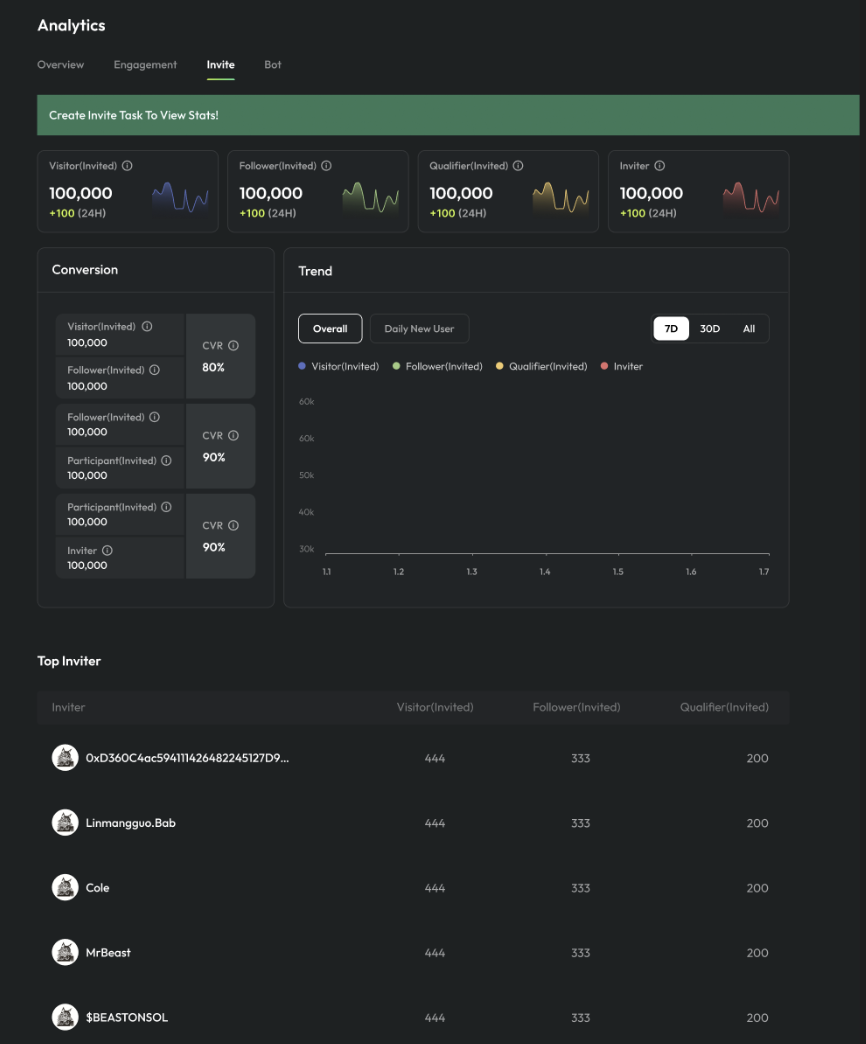 Utilize TaskOn’s comprehensive analysis tools to precisely segment and analyze users within the community, thereby maximizing the use of the community’s user network for viral spread.