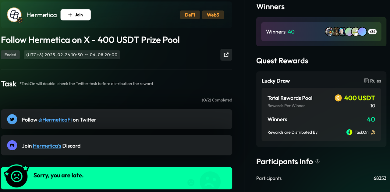 This approach—simple tasks paired with generous rewards—quickly resonated with users. Within a short time of joining TaskOn, Hermetica hosted only two campaigns yet attracted 130,000 participants, marking its initiatives as highly successful and achieving dual outcomes in both awareness and engagement.
