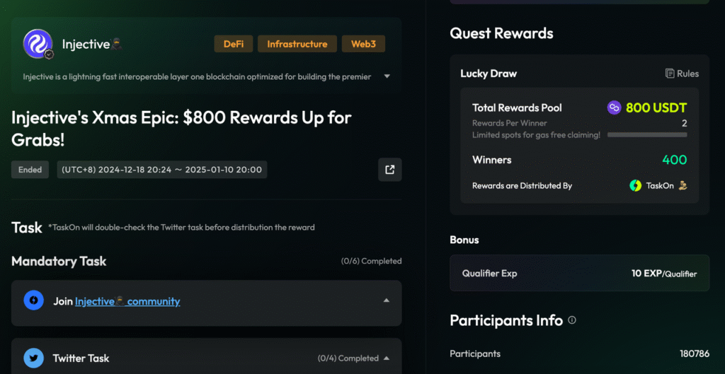 Through well-structured tasks, a reward pool of 800 USDT, and additional exposure from Taskmas campaigns, Injective’s first campaign attracted over 180,000 participants. This delivered significant success in user acquisition, while boosting real, active engagement across social media and Discord.