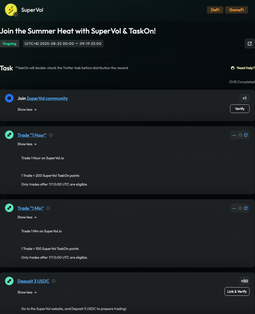 As a gamified crypto options trading platform, SuperVol implemented a point reward mechanism on TaskOn based on the number of trades, quantifying user contributions and incentivizing frequent trading behavior through point redemption, significantly boosting user activity.