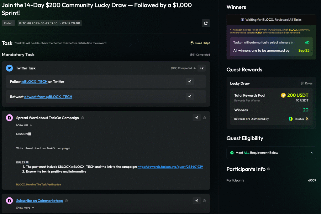 On TaskOn, BLOCX launched a series of tasks designed to boost Twitter engagement. The campaign centered around Quests, using a high-incentive Leaderboard Sprint to motivate users, supplemented by daily community Tasks to broaden participation and serve as a foundation for the sprint.
