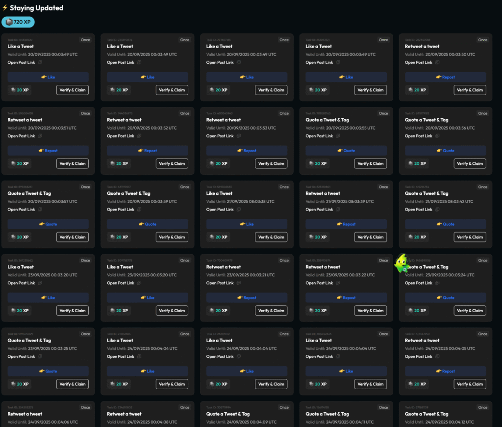 - Originality Threshold: High-point tweet tasks required at least 100 words of original content to avoid low-effort copy-paste posts. Some tasks demanded at least 4 tweets in length, encouraging users to learn about the project through other tasks before creating substantive content.