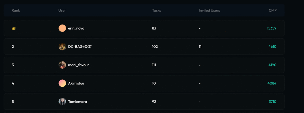 The leaderboard, ranked by cumulative CMP points, highlights top contributors like erin_nova and DC-B.ØG, inspiring others to compete and stay active.