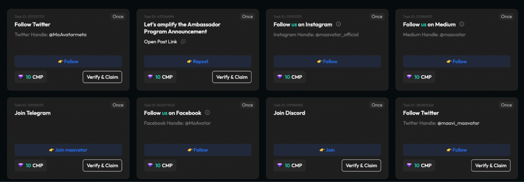 MaAvatar’s Ambassador Program Season 6 introduces a dual-point system — AMP (Ambassador Maav Points) and CMP (Community Maav Points) — both seamlessly managed through TaskOn’s quest infrastructure. This system gamifies every layer of user participation, converting actions into measurable impact and long-term rewards.