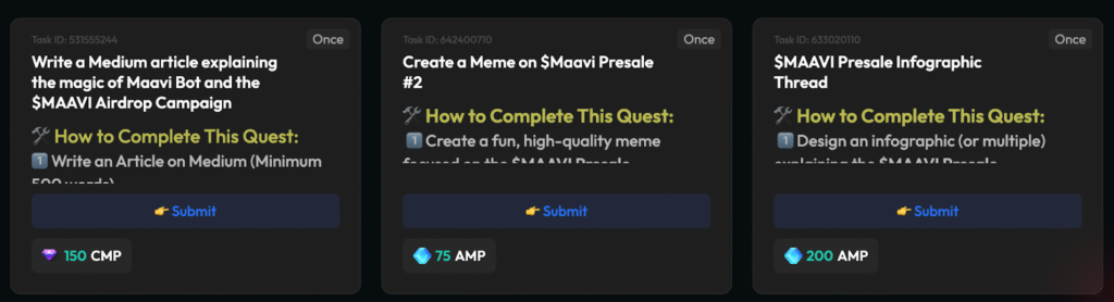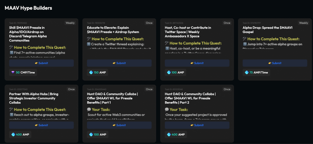 The MAAVtastic Creators tier perfectly illustrates how MaAvatar uses TaskOn to drive content-led growth. Ambassadors in this tier are encouraged to produce high-quality, community-generated content — from writing Medium articles that explain MaAvatar’s features and token system, to creating memes, infographics, and Twitter threads that highlight the $MAAVI Presale, or even hosting and contributing to AMAs that promote the project. Through these creative quests, user-generated content transforms into a scalable PR engine, expanding MaAvatar’s reach through authentic community voices. By rewarding creators directly through TaskOn, MaAvatar effectively decentralizes its marketing efforts while maintaining a consistent and unified brand message across all channels.