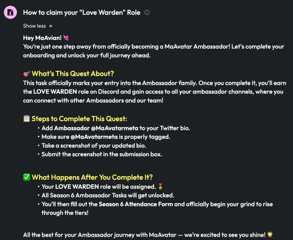 The onboarding phase begins with tasks like “Claim your Love Warden Role,” which welcomes users into the MaAvatar community. Participants are asked to update their Twitter bios with “Ambassador @MaAvatarMeta” and join the official Discord server to gain access to exclusive ambassador channels.