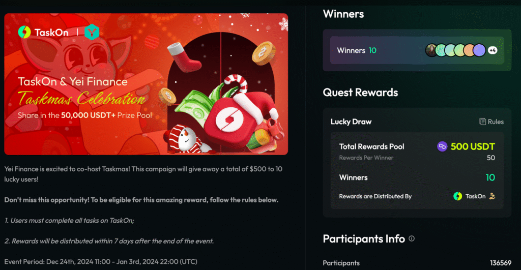 Yei Finance partnered with TaskOn and, within just two campaigns, attracted over 170,000 participants. Tens of thousands of on-chain transactions provided Yei with a new traffic source, bringing in and retaining more than 100,000 new users across its community and social media channels—far exceeding expectations.