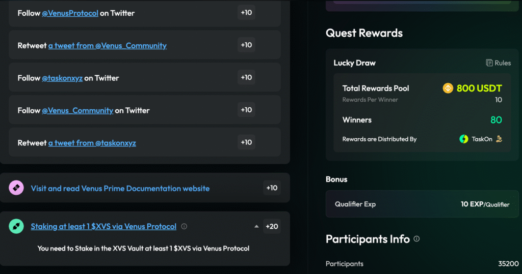 - TaskOn 2nd Anniversary Event (1,800+ participants): $500 in rewards, social media and community tasks, combined with staking at least 1 $XVS in the XVS Vault via Venus Protocol and supplying at least 100 USDT in the Venus Protocol Arbitrum Core Pool.
