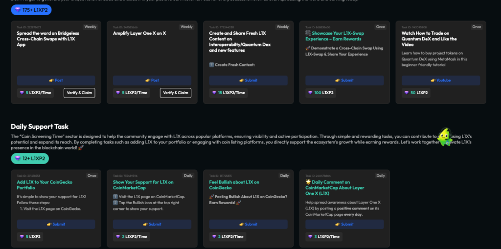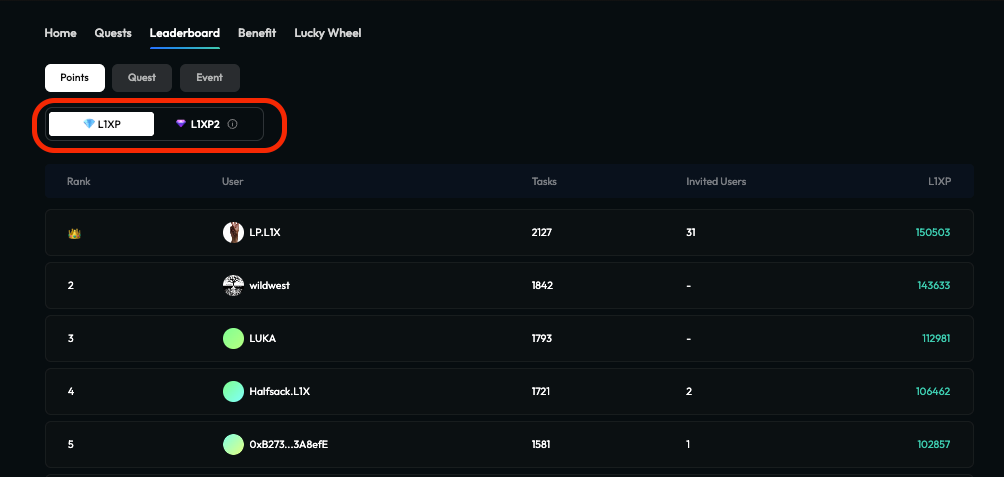 To create an efficient Points system and encourage gamification of rewards, the project has introduced different points system during multiple phases. For example, L1XP and L1XP2 represents two Airdrop seasons, each with different tasks and rewards.