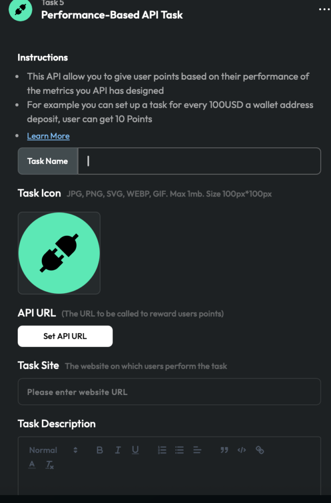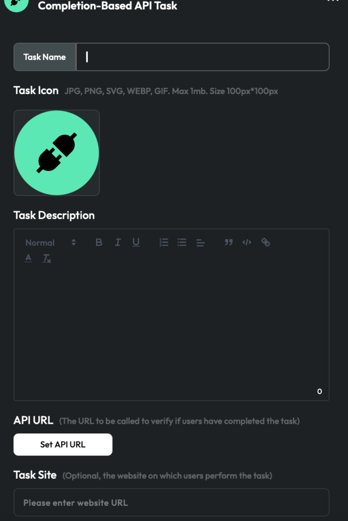 TaskOn offers two flexible verification modes — Completion-Based and Performance-Based — designed to fit the needs of different business use cases. Both rely on API endpoints that connect directly to your backend or smart contracts, ensuring that user data and actions are validated automatically and securely.