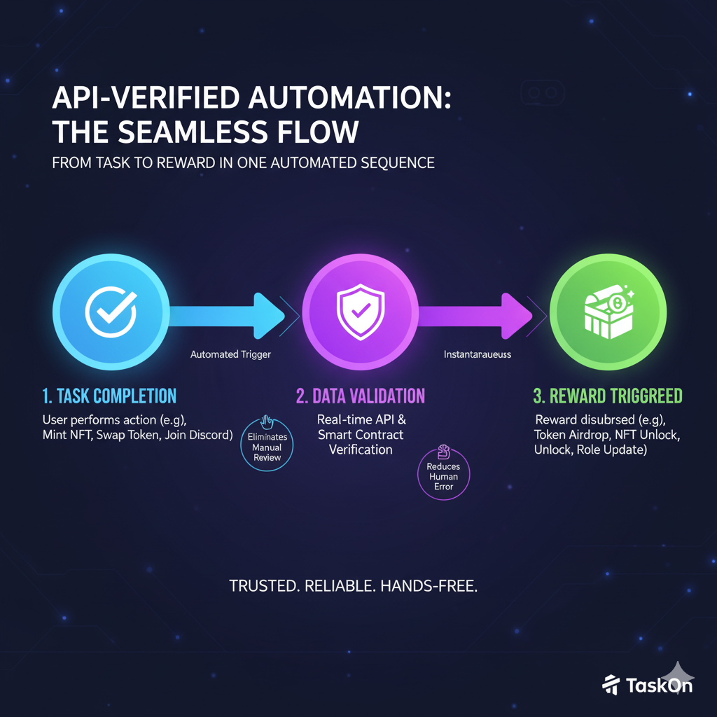 That’s where TaskOn’s API-Verified Automation Service comes in — a next-generation verification framework that connects on-chain and off-chain data in real time, ensuring secure, reliable, and hands-free task validation.