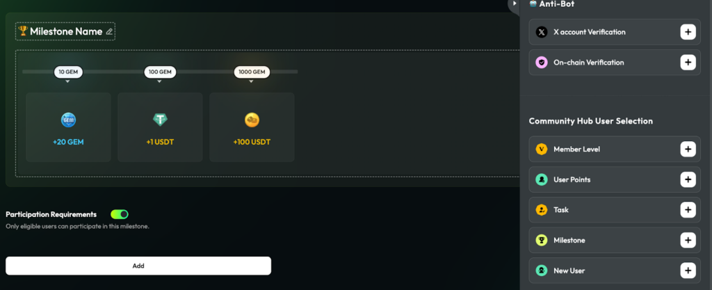- Milestones complete the loop of “Phased Goals—Direct Claiming”: supporting thresholds based on points or levels, with rewards selectable from Token/Role/Points. This is perfect for breaking down long-term tasks into executable small steps, rewarding long-term user contribution—the more interaction, the greater the reward.