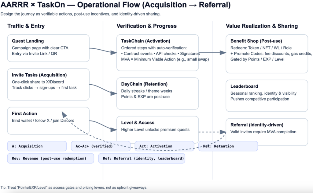 TaskOn transforms AARRR from “theory” into an “executable growth engineering system” via tools like Quest, TaskChain, DayChain, Point Levels, Automated Verification, Benefit Shop, and Leaderboard/Referral.