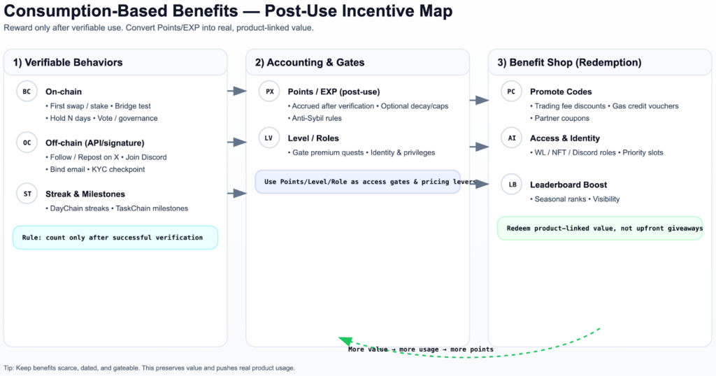 | Activation | Complete the first “verifiable” core action | First on-chain tx/Signature completion rate, Key step completion rate | TaskChain (Sequential tasks), Automated Verification (Contract Events/API/Signatures) |