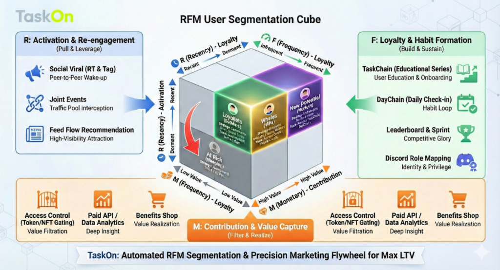 By linking RFM grouping directly with TaskOn’s Points/Level/Milestone and Benefits Shop, we create a backend incentive loop: “Use more → Get more rewards → Value increases.”