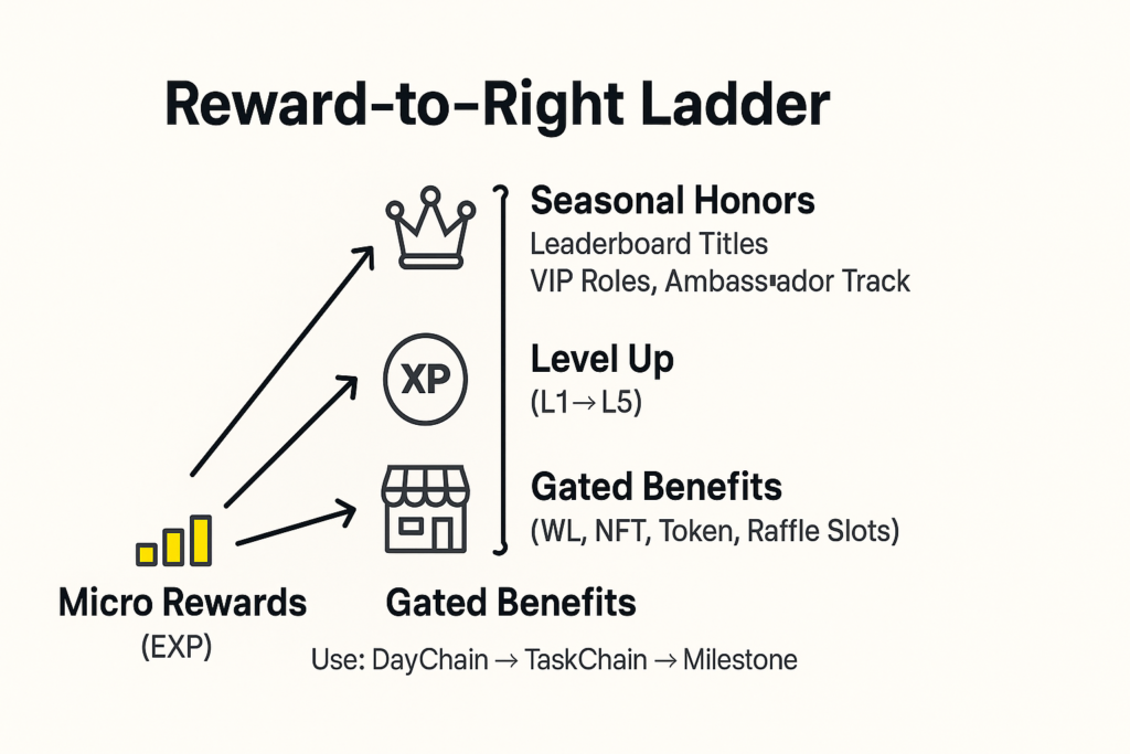 | Monthly/Seasonal | Milestone: 30/60/90 Day Cumulative Targets | Review (On-chain accumulation/Frequency/Volume) | Level Up → Unlock Benefits Shop scarce slots (WL, NFT, Raffle entry) | Back-loaded High Value Return |
