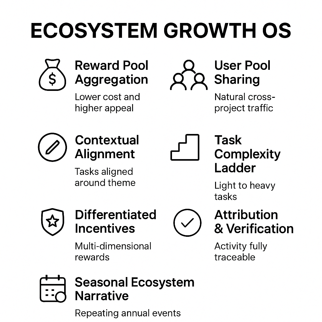 TaskOn has upgraded ecosystem synergy from one-off events into a growth model that is: Co-Growth, Template-based, Auto-Verified, Attributable, and Sustainable (Seasonal Growth).
