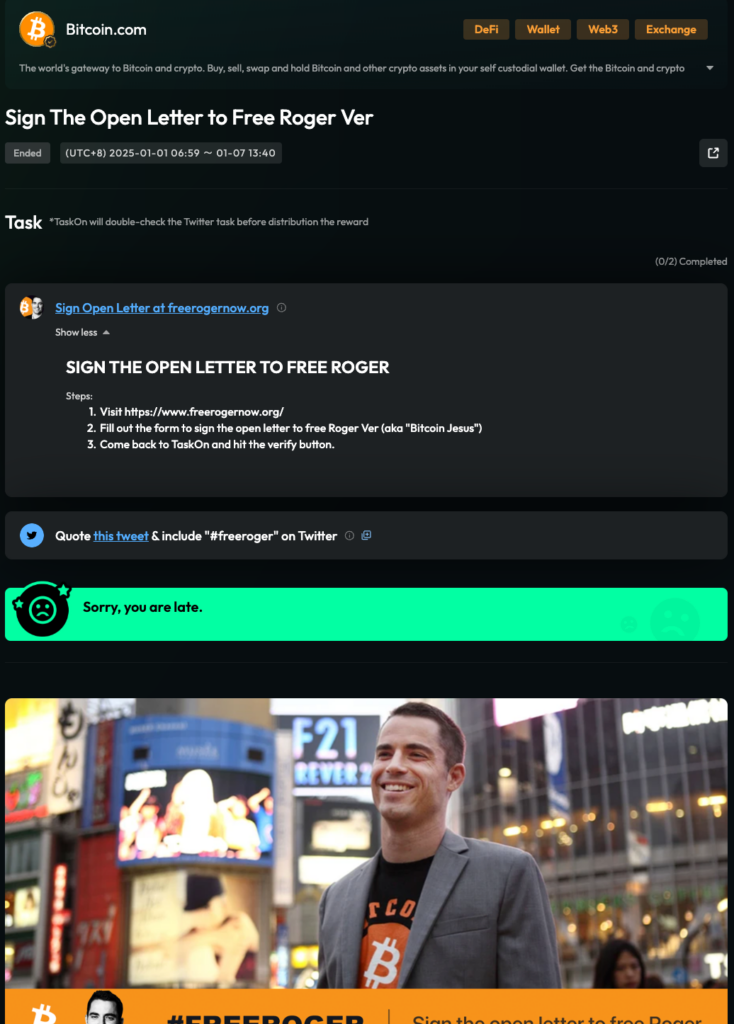Bitcoin.com launched a highly controversial yet viral task on TaskOn—the “Free Roger Ver” petition Quest.