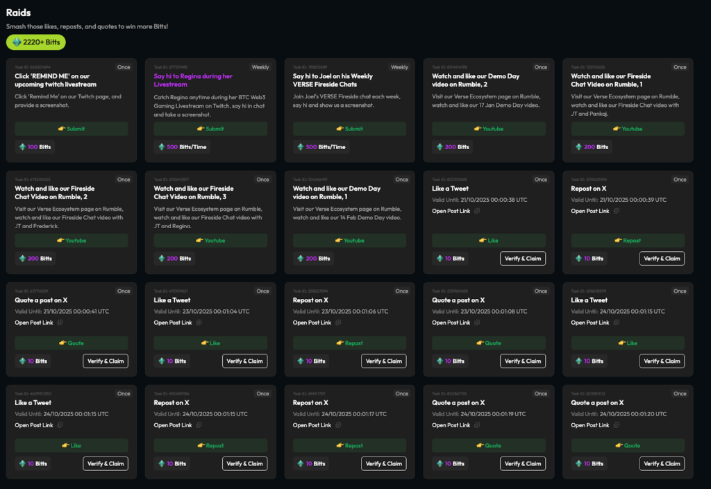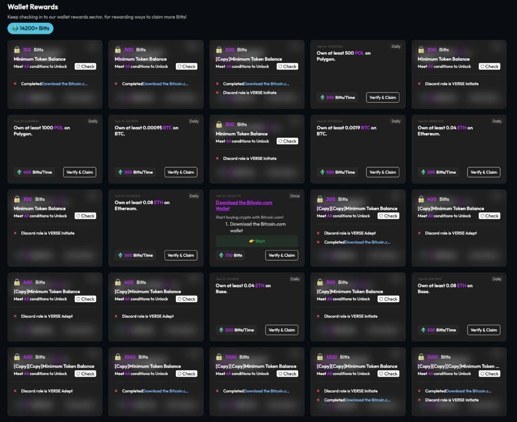 - Some core tasks are locked, open only to users who complete specific pre-requisite tasks or hold VERSE tokens.